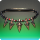 Around her neck lies a necklace of rings of various colors, gems and sizes. From coral rings with pearls to golden bands with red rose cut gems to a rolanberry shaped one and more. She counts them all every day and looks to them for good luck. Mementos from her loves.